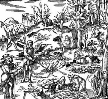 Geschrieben von dottore am 16. August 2004 16:47:59 Hi, Silber wird heute zumeist als Kuppelprodukt und im Bergbau gewonnen. Das war nicht immer so. Es gab zahlreiche obererdige Silberfunde. Sobald das Metall gefunden wurde, ertönte das bekannte "Große Berggeschrey", etwa überliefert aus Annaberg, Ende 15. Jh. (1491), da dann zahlreiche Prospektoren anzog. Von der Oberfläche wurde dann in die Tiefe gegraben, bis die Minen erschöpft waren. Den Übergang vom Oberflächenfund zum eigentlichen Bergbau zeigen die zahlreichen Abbildungen des großen Werkes "De re Metallica" von 1556 des Georg Bauer (Agricola), was u.a. diese Bild belegt (ein noch früheres mit ähnlicher Darstellung ist als Vorblatt zur St. Joachimsthaler Bergordnung von 1518 zu sehen, das mir vorliegt):
