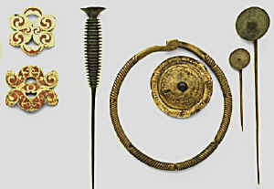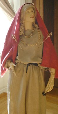 [Was an Südrussland, das seinerseits mit Skandinavien verbunden war, interessiert, sind nicht die Sklaven, die - wie die Ösenringe (der große runde Gegenstand; gerade einen erworben, der genau um den Hals passt) zeigen (die Abb.en ermöglichen einen Größenvergleich zu den Fibeln (Stecknadeln) im Gewand - in Skandinavien gang und gäbe waren
