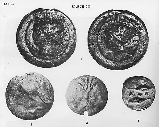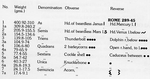Wir sehen ein Warengeldsystem, das von ca. 17 g schweren Münzen bis 400 g schweren Münzen reicht. Um sich diesem System in etwa zu nähern, darf die aus der Antike überlieferte Relation zwischen AE und Silber nicht übersehen werden. Sie lag etwa bei 280/300 : 1. Die schwerste Münze aus der Zeit, da die Römer Warengeld als Tauschmittel entdeckten, das As, war also etwas mehr als 1 g Silber wert. Ein Gramm Silber kostet heute ca. 30 Pfg. Da es wenig ersichtlichen Grund gibt, etwa an einer relativ stabilen Preisrelation zwischen Silber und anderen Waren über die Jahrhunderte hinweg zu zweifeln ("Preisrevolutionen" hin oder her), sollte ein ca. 280 g schweres As zumindest (!) ausgereicht haben, damals (!) ein Huhn zu kaufen. Und so sahen die römischen Warengeld-Tauschmittel aus: