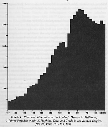 Geschrieben von dottore am 15. Juli 2001 16:26:24 Guten Tag! Das es auch bei einem voll funktionierenden Metallstandard Deflationen gegeben hat, ist wenig bekannt. Wir sprechen hier nicht von der 1930er ff. Deflation, zu der in Bezug auf das Metallgeld bereits genug geschrieben wurde: Die Deflation kam nicht vom Gold, sondern aus den unbedienbar gewordenen Krediten plus Bankzusammenbrüchen usw., usw., ich stelle aber unten noch ein Mal zur Sicherheit den Friedman-Chart dazu. Eine berühmte Deflation war jene, die die römische Republik hinweg gefegt hat. Sie ist in dieser Darstellung gut zu erkennen: