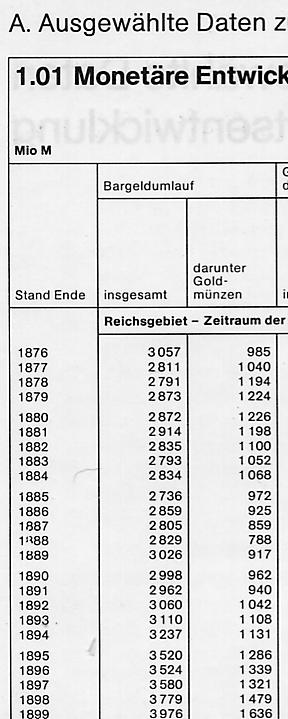 Der Gipfel liegt um -80, also zur Zeit des Dikators Sulla, der seine politischen Gegner, Klartext: die Gläubigerfraktion, mit Hilfe der bekannten "Proskriptionen" ermorden ließ. Er konnte allerdings nur einen Teilerfolg erreichen. Die inzwischen aufgelaufenen Schulden waren schon viel zu hoch. Also begannen sofort wieder die sattsam bekannten Überschuldungsprobleme. Der Name CATILINA steht für das sich abzeichnende Desaster. Lucius Sergius Catilina (-106 bis -62)war ein überschuldeter Senator, der verzweifelt nach "Novae tabulae" verlangte, also nach neuen (= gelöschten) (Wachs-)tafeln auf denen die Gläubiger ihre Forderungen - vom Schuldner gesiegelt und daher jederzeit vollstreckbar - verbucht hatten. Catilina versuchte, nachdem er bei den Wahlen zum Konsul durchgefallen war, einen landesweiten Schuldneraufstand, dessen nähere Umstände in den vier Reden Ciceros gegen ihn geschildert werden ("Quousque tandem, Catilina..." - wie lange noch, Catilina...). In der ersten Rede bezieht sich Cicero ausdrücklich auf die Insolvenz Catilinas, und weist darauf hin, dass seine Wechsel an den nächsten Iden (= Monatsmitte, dann waren die römischen Wechsel spätestens fällig) platzen würden. Catilina, den sicheren finanziellen Untergang vor Augen, zog mit seinem Heer gen Norden und wurde schließlich von regierungstreuen römischen Truppen bei Pistoria (Etrurien) im Jahr -62 bis auf den letzten Mann getötet. Sein Feldherr Manlius rief noch sinngemäß aus: Lieber hier aufrecht und ehrenvoll sterben als die Schande des Bankrotts. Weitere Versuche verkrachter Existenzen wie Julius Cäsar, der bei der Abreise nach Gallien (nicht um dort römische Sitten und Religion einzuführen, sondern um zu einem Metall-Inkasso zu schreiten), von seinen Gläubigern beinahe vom Pferd geholt worden wäre und der auch bedenkenlos römische Tempelschätze mit Hilfe seiner Leibgarde plünderte, brachten nur vorübergehend Erleichterung, siehe den vorletzten Balken von links. Cäsar rüstete daher bereits zu einem weiteren Inkasso-Feldzug (gegen die Parther, bei denen sich einst schon Alexander der Große bedient hatte). Doch bevor es dazu kommen konnte, wurde er von der Gläubigerfraktion im Senat erstochen. Dies war wiederum an den Iden, diesmal März (= großer Schuldtermin, da Jahresende, das römische Jahr endete mit dem Februar und die Schuldner hatten dann noch spätestens zwei Wochen Zeit, um glatt zu stellen). Julius Cäsar, inzwischen Diktator auf Lebenszeit, wurde ermordet, weil er seine "Lex Julia de Bonis Cedendis" durchsetzen wollte, eine Gesetz, das vorsah, dass die Schuldner als Zahlung Güter (bona) abtreten konnten (cedere) - und zwar zu den Preisen, die zum Zeitpunkt der Schuldaufnahem gegolten hatten (in der langen Deflation waren sie immer weiter gefallen, was die Lage der Schuldner natürlich ausssichtslos machte). Erst durch einen weiteren großen Gläubigermord, den das zweite Triumvirat (Agustus, Marc Anton, Lepidus), nach dem Tode Cäsars initiierte, konnte die Deflation fürs erste gestoppt werden, da die Leute, die Schulden hätten eintreiben können in Form ihrer abgeschlagenen Köpfe auf dem Forum Romanum zu besichtigen waren. Die deflationäre Depression brach unter Tiberius wieder auf und endete im Mega-Crash des Jahres +33 mit einer erneuten Komplettenteignung der Gläubiger. Ausführlich dazu: Guglielmo Ferrero, "Größe und Niedergang Roms", 1908. In den "modernen Geschichtsbüchern" werden diese Dinge fast immer unterschlagen. Die Deflation, die den Untergang der römischen Republik herbeiführte, war nun nicht etwa, wie aufgrund der ersten Grafik vorschnell geschlossen werden könnte, eine geldinduzierte Deflation, sondern eine schuldeninduzierte. Nicht das Verschwinden der Denare löste die Deflation aus, sondern im Gegenteil: Die Deflation löste das Verschwinden der Denare aus. Da die Preise allgemein fielen (und zwar wegen des verzweifelten Versuches der Schuldner, durch Notverkäufe noch an Geld zu kommen) wurde das Geld immer teurer ("steigender Geldwert") und über das Geld natürlich das Metall, das in fester Parität zum Geld stand (Denar = knapp 4 g Silber). Es lohnte sich also Münzen aus dem Verkehr zu ziehen und das Metall teurer zu verkaufen. Dies ist der übliche Teufelskreis, der sich bei Metallgeld immer zeigt, nachdem (!) eine schuldeninduzierte Deflation erst einmal eingesetzt hat. Die können wir auch sehr schön an dieser etwas "moderneren" Tabelle beobachten, die zeigt, wie sich der Goldmünzenbestand im deutschen Kaiserreich entwickelt hat: