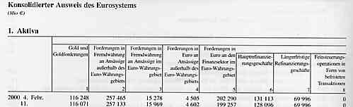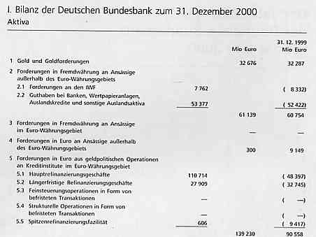 Geschrieben von dottore am 11. November 2001 11:38:13 Hi, der mainstream behauptet immer, dass Notenbanken "Kredite" vergeben würden. Auch heißt es immer wieder, die Notenbanken würden einen "Zinssatz" forden, den man natürlich nur fordern kann, wenn es sich um einen Kredit handelt. In den laufenden Bundesbank-Statistiken war seit alters die Rede von Krediten an Kreditinstitute und Nichtbbanken Das stellt sich in der Bilanz der Buba dann unter Position 5 wie folgt dar: