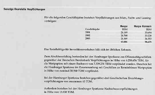 Nun hatte ich vor einiger Zeit der EZB die Frage gestellt, wo denn die entsprechenden Gegenbuchungen dieser "Forderungen" in den Bilanzen der des Finanzsektors (der Kreditinstitute also) zu finden seien. Die Antwort kam mit einiger Verzögerung, angeblich nach "Rückfrage bei einer großen Geschäftsbank", aber sie kam und lautete: "Unter 'sonstigen Verbindlichkeiten gegenüber Kreditinstituten'." Diese Aussage der EZB ist KOMPLETT FALSCH! Ich beweise dies anhand der Bilanz der größten deutschen Sparkasse, der HASPA in Hamburg. Die HASPA verbucht unter Position 1 der Passiva Verbindlichkeiten gegenüber Kreditinstituten (täglich fällig oder mit vereinbarter Laufzeit und Kündigungsfrist) Darunter erscheinen die Verbindlichkeiten gegenüber der Bundesbank nicht. Sie erscheinen auch nicht unter Punkt 5 Sonstige Verbindlichkeiten worunter Verbindlichkeiten im Rahmen der sozialen Sicherheit, Steuerverbindlichkeiten und sonstige Verbindlichkeiten erscheinen, die nebenbei weniger als ein Promille der Bilanzssumme der HASPA ausmachen (59 Mio zu 69 Mrd €). Wo verstecken sich also die "Kredite", die die Notenbank an die HASPA vergeben hat? Antwort: Sie sind überhaupt nicht in der Bilanz enthalten, in der - betreffend "monetäre Größen" - nur unter Position 1 der Aktivseite dies zu finden ist: Barreserve, a) Kassenbestand und b) Guthaben bei der Deutschen Bundesbank mit zusammen 449 Mio €. Zur "Verbindlichkeit" dieses größten deutschen Sparkasseninstituts ist allerdings etwas außerhalb (!) der Bilanz zu finden, und zwar unter Sonstige Angaben Darin erscheint als Angabe zu "sonstigen finanziellen Verpflichtungen" dies im Geschäftsbericht: